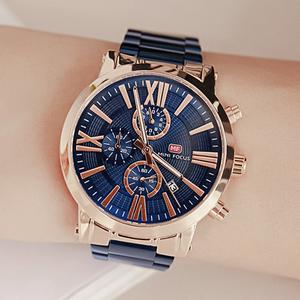 【RADIANT STAR】[中性款]MINIFOCUS片刻永恆大錶面真三眼日期顯示金屬鍊帶手錶-藍面玫金框藍帶