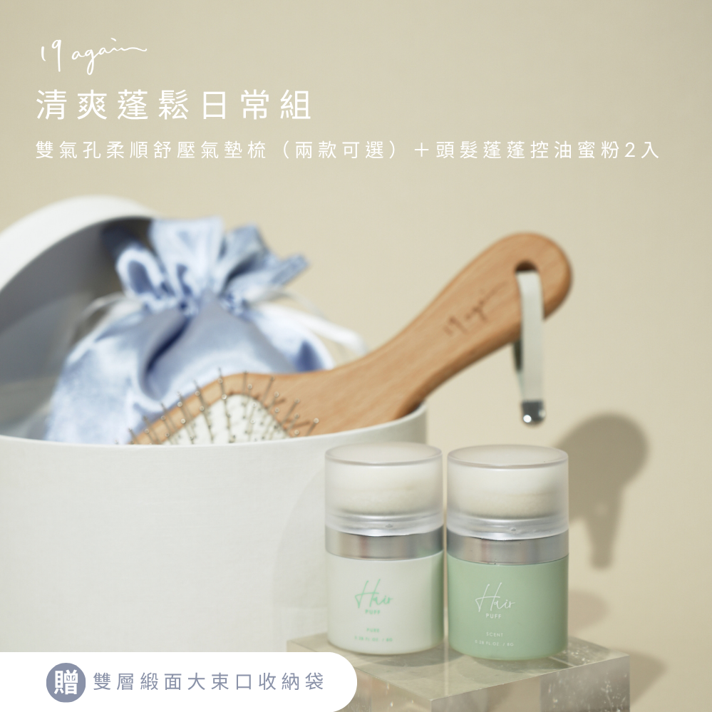 歲末感謝禮推薦【19again】輕巧蓬蓬旅行組:柔順舒壓氣墊隨身梳+頭髮蓬蓬控油蜜粉2入 (贈)雙層緞面束口收納袋(大)-送禮推薦/生日禮物