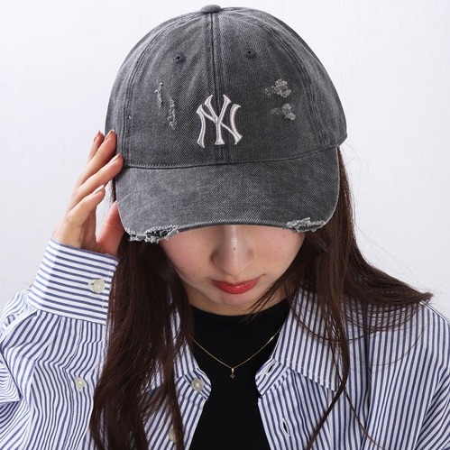 【韓國MLB】NY棒球帽-水洗刷舊深灰色 韓星Karina同款 MLB紐約洋基隊小logo刷破刷舊帽子(3ACPVV34N-50CGS) New Era情侶帽 七夕交換禮物 女友送禮