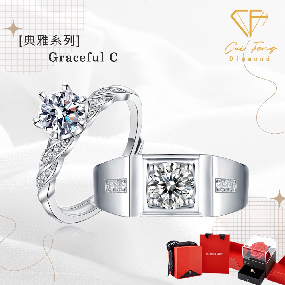 [快速出貨]【CF鑽飾】戒指 典雅B《莫桑鑽一克拉男女對戒》新年禮物 🌹贈玫瑰花禮盒 情人節 生日送禮 紀念日