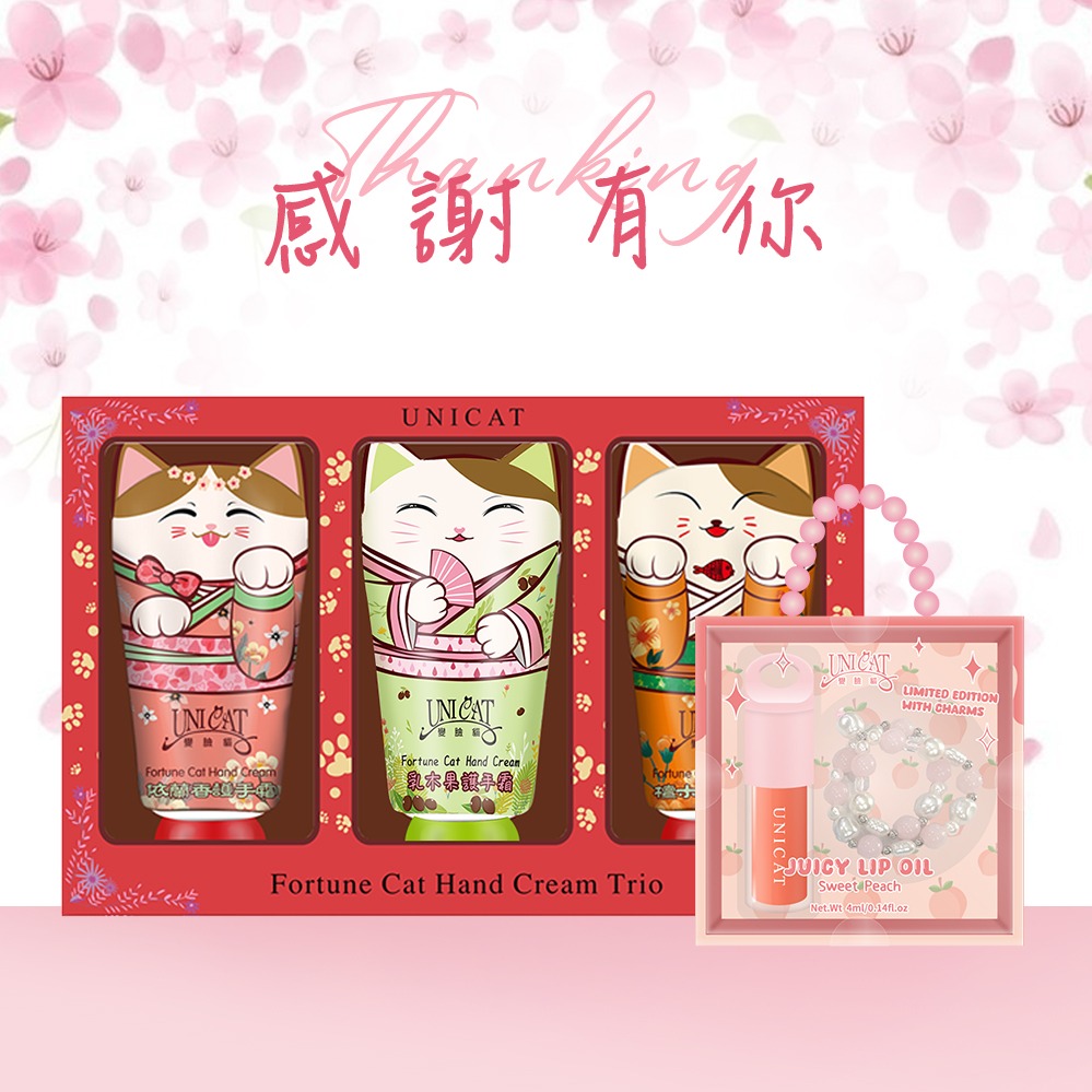 【UNICAT 變臉貓】新年快樂|水光保濕玻璃唇油(草莓/蜜桃/蜂蜜)+旺旺手氣/大吉大利/好緣自來 護手霜2入禮盒 任選 新年禮盒