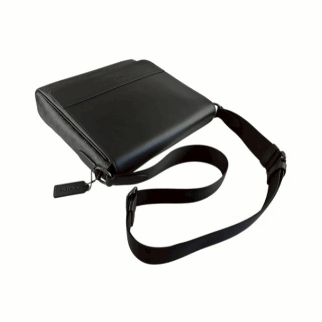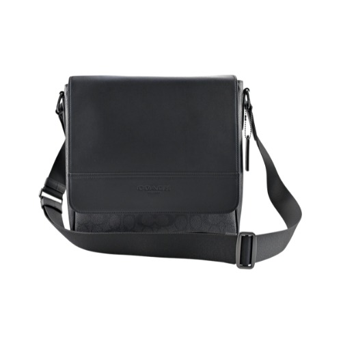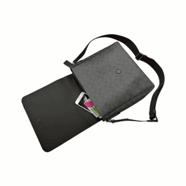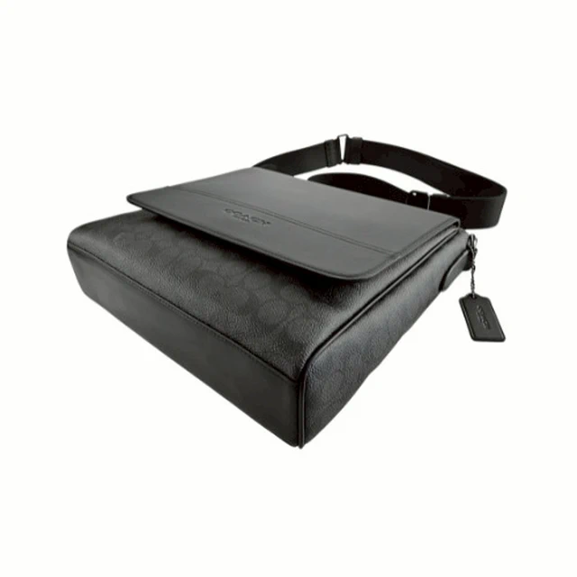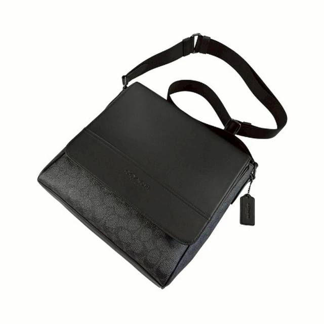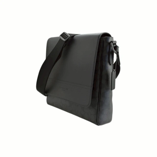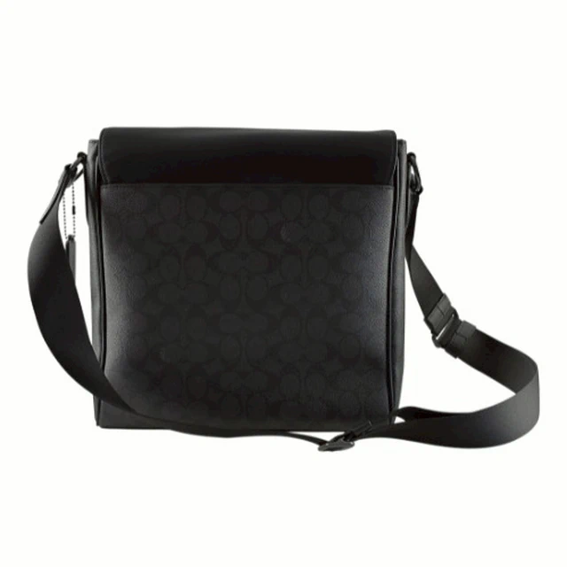 [平輸版] 【COACH】黑色C LOGO緹花布拼接素面皮革上翻蓋斜背男包 真品平輸