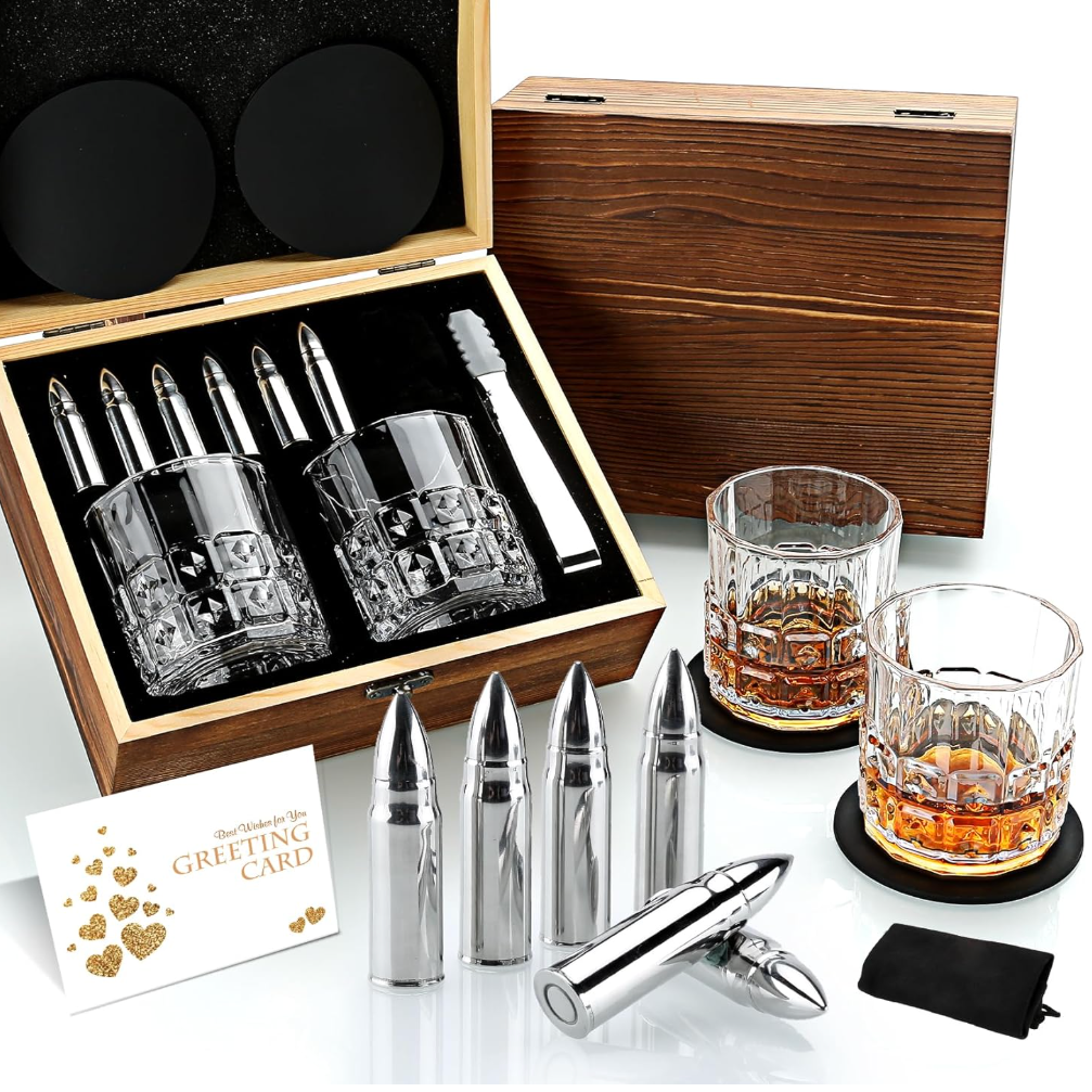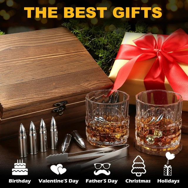 威士忌4合一精緻質感木盒禮盒 (威士忌玻璃杯 2 件組 波本威士忌杯 |6顆花崗岩冰涼岩 |花崗岩收納盤 |夾子) 最佳喬遷之禮 交換禮物 最佳禮品 最佳飲酒禮品