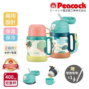 【日本孔雀Peacock】兒童嘉年華 禮物精選-耐衝擊底座 水杯+吸管兩用 兒童不鏽鋼保溫杯水壺400ML(握把+背帶設計)