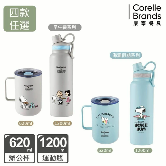 (買1送1)【美國康寧 Snapware】SNOOPY史努比鋅動輕瓷大容量不鏽鋼手提保溫杯800ml+玻璃瓶710ml