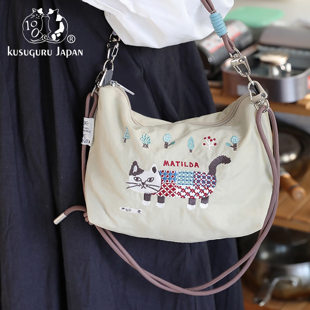 貓奴的療癒日常【Kiiwi O!】Kusuguru 日本眼鏡貓.刺繡貓咪月亮包 (共4款可選) 斜背包 側背包 出遊 購物 逛街 旅行 輕巧耐裝 可愛療癒 女生禮物