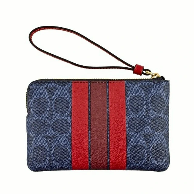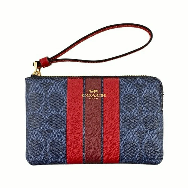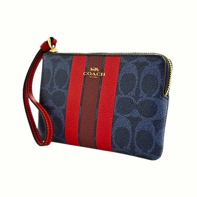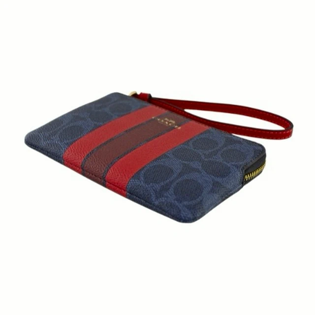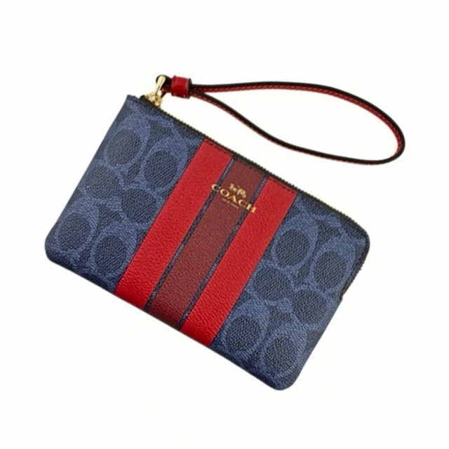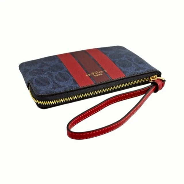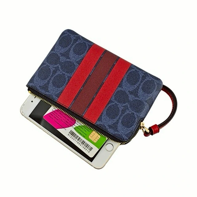 [平輸版] 【COACH】粉桃紅撞色格紋帆布L型拉鍊中款手拿包 真品平輸