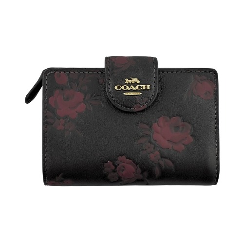 [平輸版] 【COACH】仿刺繡亮粉燙印蝴蝶皮雕黑色素面皮革金字牌摺口釦式雙摺中夾 真品平輸