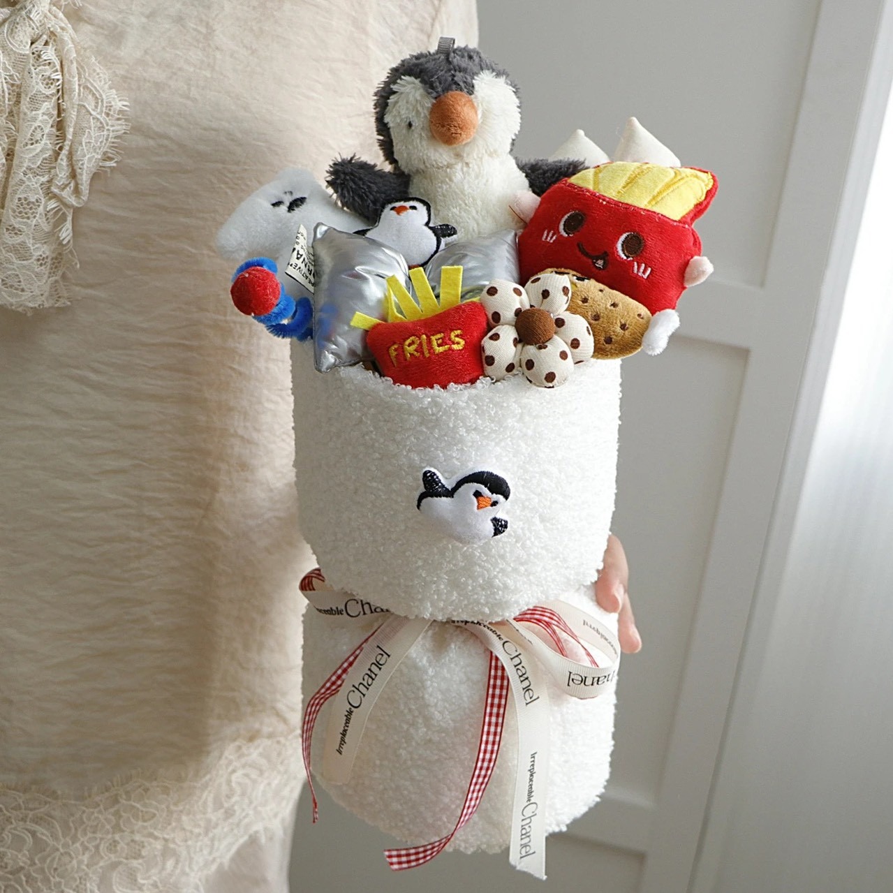 預購【LAMIE】泰迪絨白線條單隻小狗(小束) 卡通花束 絨毛玩具花束 玩偶花束 花束