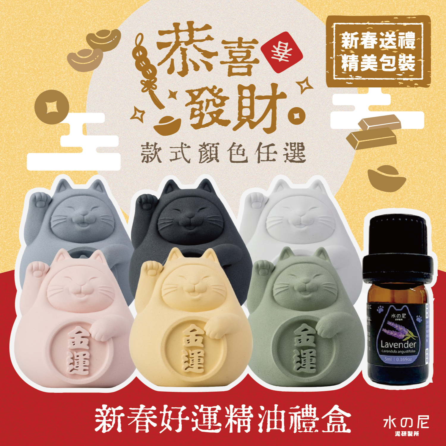 收禮人自選顏色 🎁 hoi!LAB實驗室香氛-金運招財貓擴香石 (附10ml精油)🎁招財 開運 日常 生日🎁送禮首選