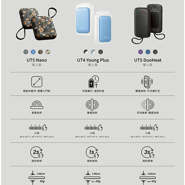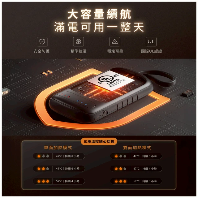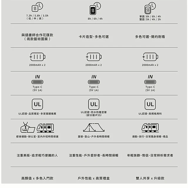 其他說明事項: 電池容量:2500mAh鋰電池*2 充電時間:3.5小時*2 單面使用時間:4~8小時*2;雙面使用時間:3~5小時*2 輸入:TypeC 5V/1A 尺寸(CM):8.7*4.85*1.56cm*2 重量:69g*2 加熱溫度:3檔,100° - 108°F (38--42℃) / 109° - 117°F (43--47℃) / 118° - 125°F (48--52℃) 指示燈:紅色/藍色 產品材質:鋁合金、ABS塑膠 配件:TYPEC 充電線、說明書