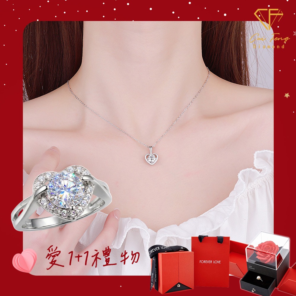 [快速出貨]【CF鑽飾】214情人節限定《捧💐款 項鍊+戒指》莫桑鑽 1+1套組 情人節 贈玫瑰花禮盒 生日禮物 送禮