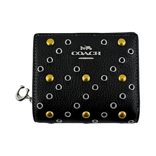 [平輸版] 【COACH】銀色流星印花黑色底PVC C字拉鍊袋釦式雙摺短夾 真品平輸
