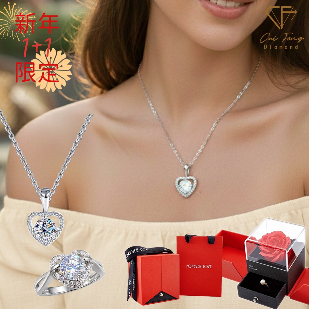 [快速出貨]【CF鑽飾】新年限定《愛心款 項鍊+耳環》莫桑鑽 1+1套組 情人節 贈玫瑰花禮盒 生日禮物 送禮