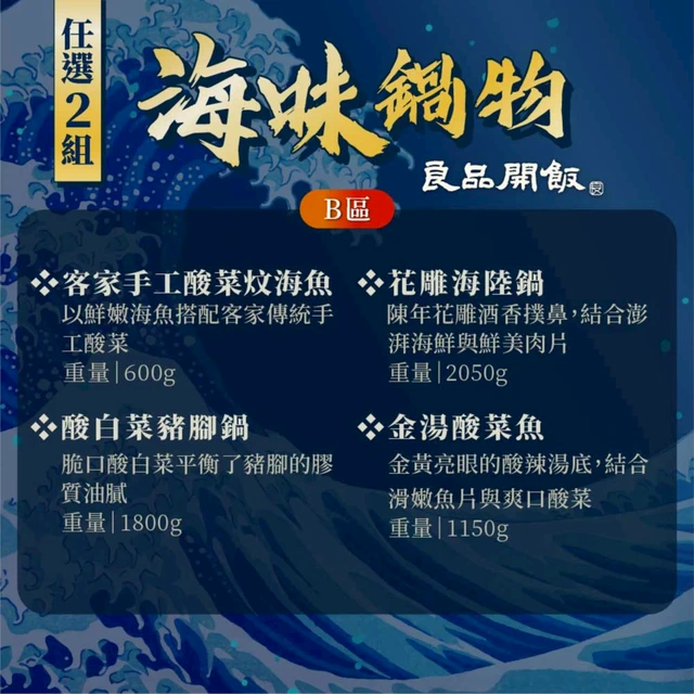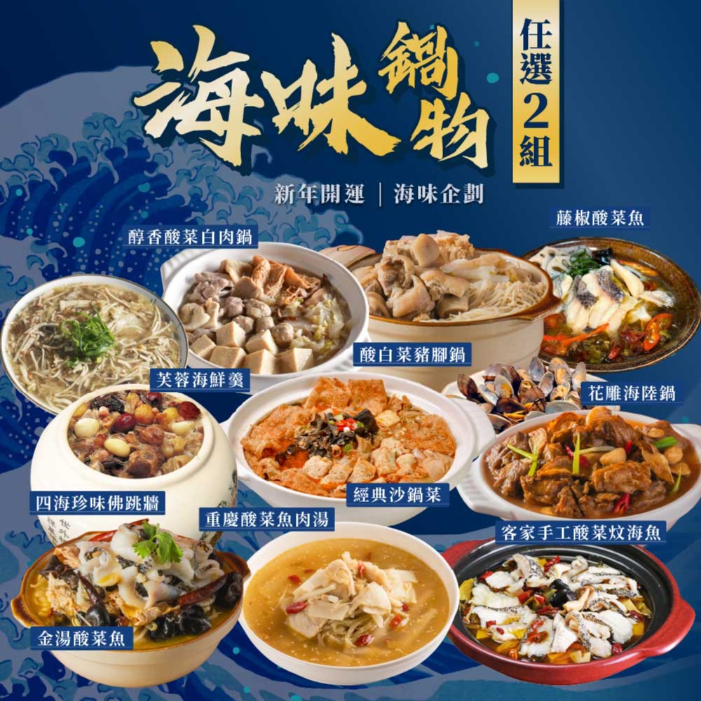 【預購2/2-2/6出貨】【良品開飯】海味鍋物任選2組(年菜 海鮮鍋物 酸菜魚 佛跳牆 砂鍋菜 酸菜白肉鍋 新年開運)