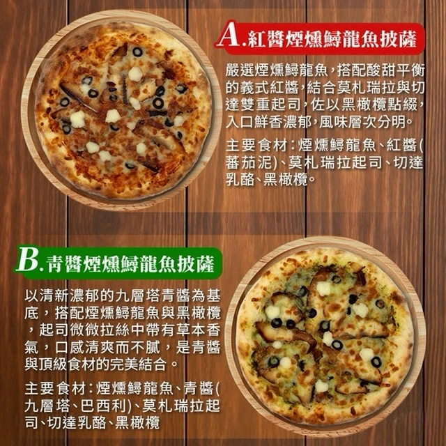 【慢食優鮮】8' 義式手工窯烤冷凍Pizza 三入組|紅醬煙燻鱘龍魚Pizza x1/青醬煙燻鱘龍魚Pizza x1、瑪格麗特Pizza x1、德式香腸Pizza x1