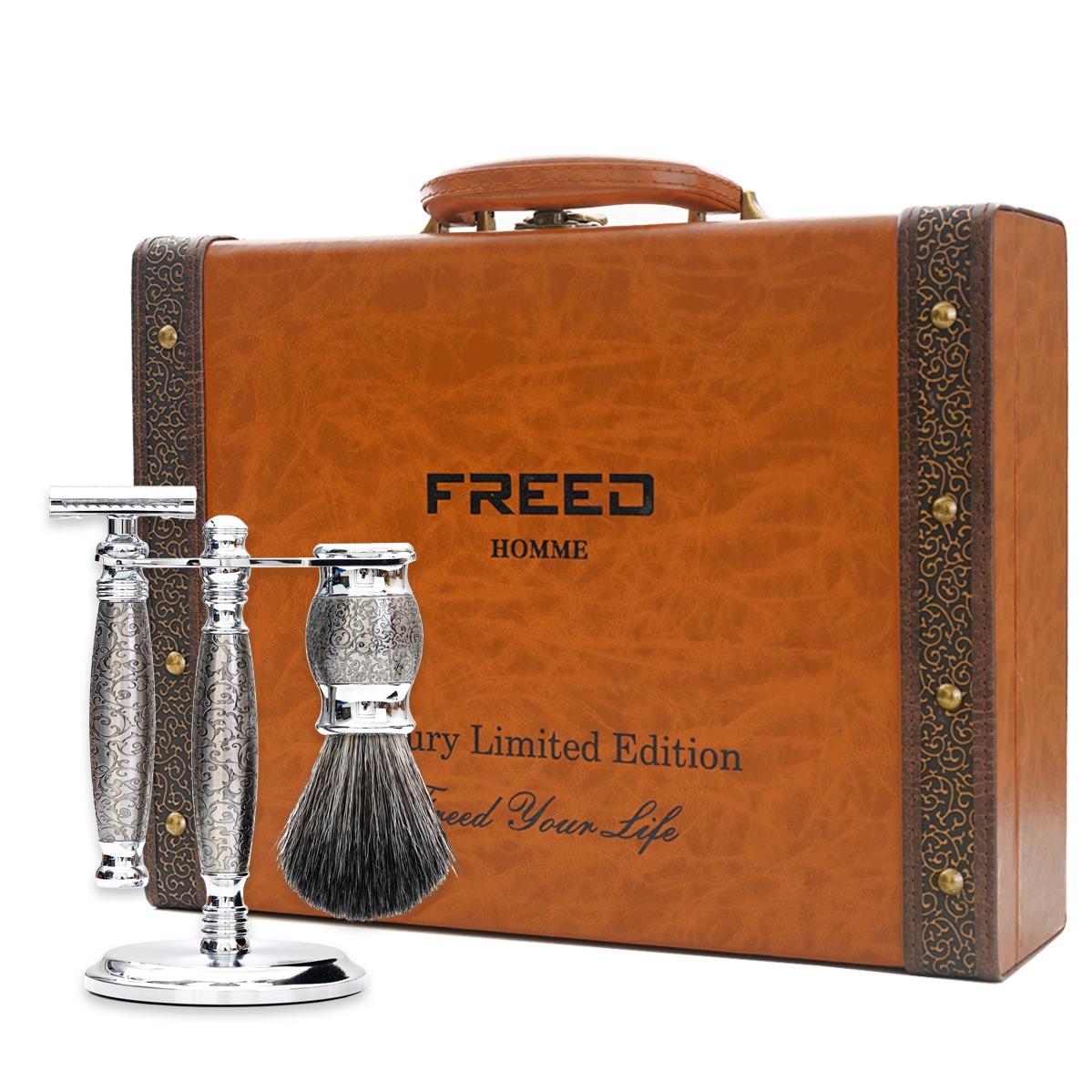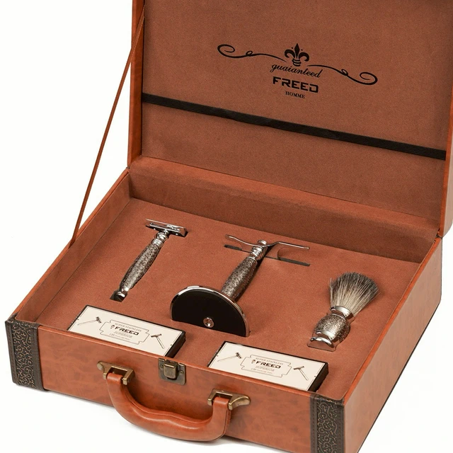 [快速出貨]【FREED】五刀式刮鬍刀豪華禮盒四件組(馬鞍棕) 客製化刻字 生日禮物 送禮推薦 男生禮物 摩羯座 水瓶座 禮物獨家 新品上市 情人節禮物