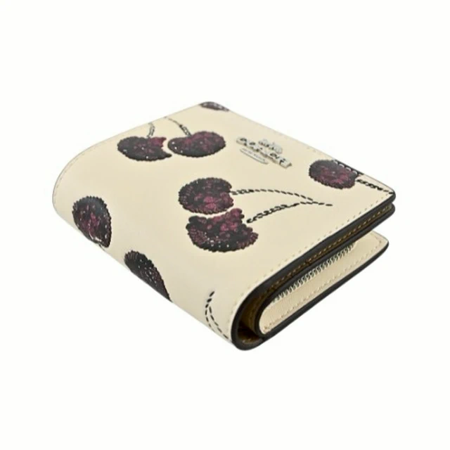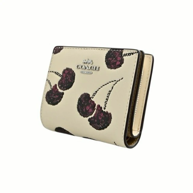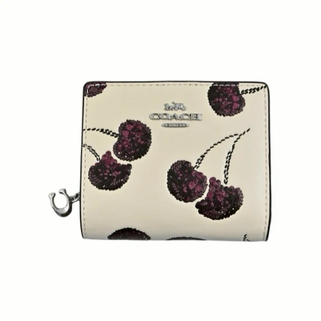 [平輸版] 【COACH】仿刺繡櫻桃皮雕亮粉燙印白堊色皮革鍊帶頸掛斜背方型卡夾零錢小廢包 真品平輸