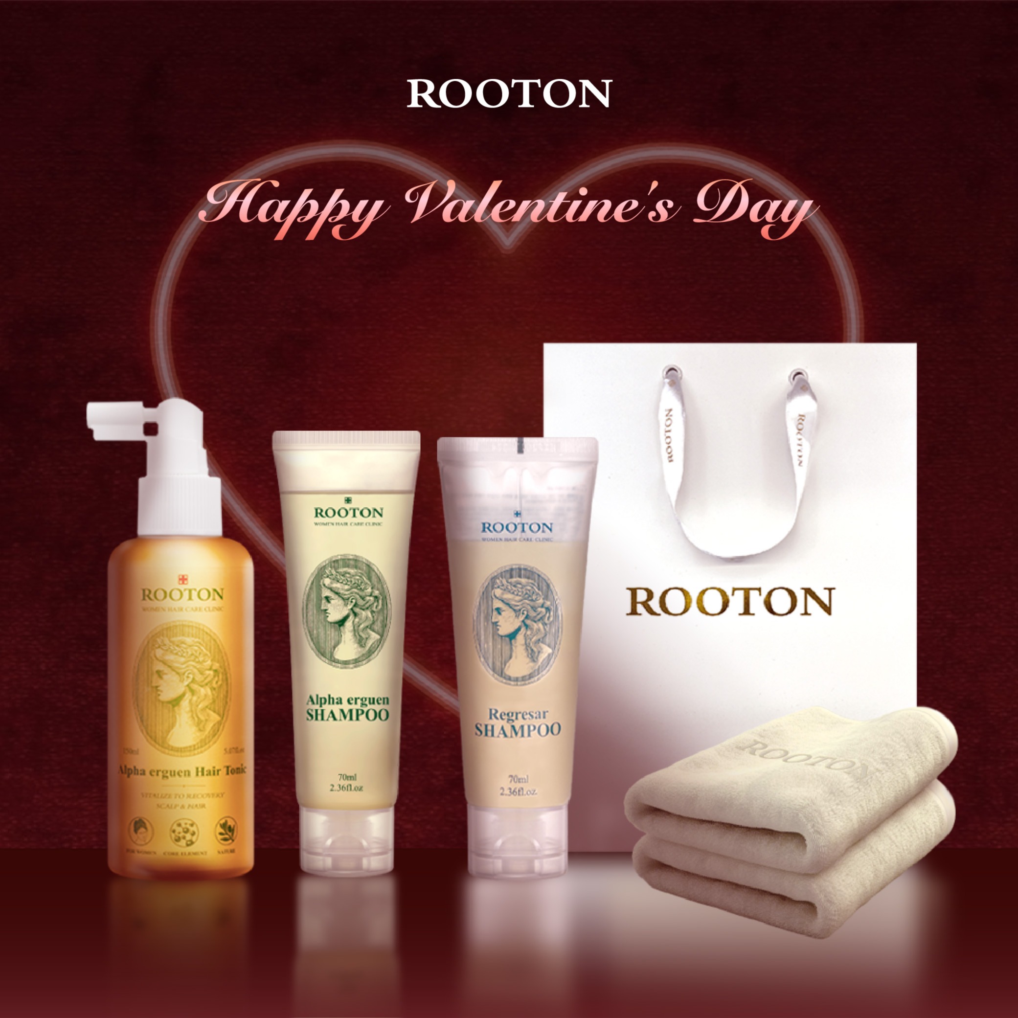 快速出貨【ROOTON】情人節快樂!髮根噴霧150ml+甦活植萃洗髮精200ml+沐浴膠5ml+身體乳5ml+甦活養髮梳+棉麻束口袋+情人節小卡+淨萃禮盒