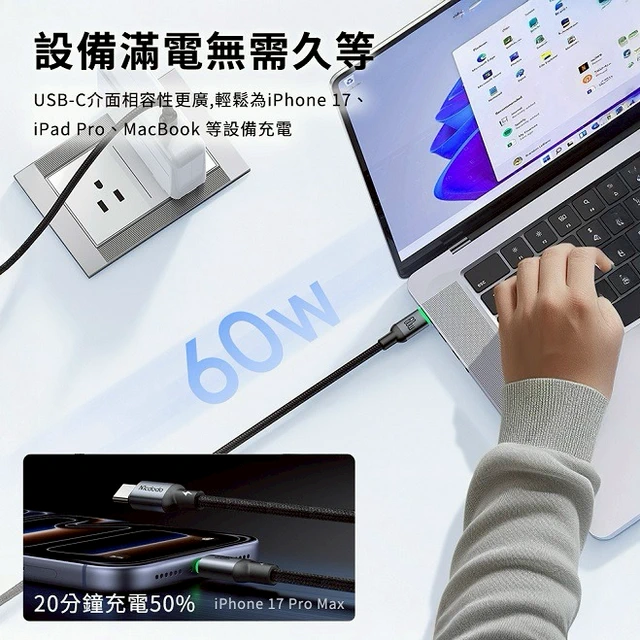 【Timo禮品館】MCDODO麥多多 Buy easy系列 60W Type-C to Type-C 帶燈編織快充傳輸線(CA-6870)(1M)