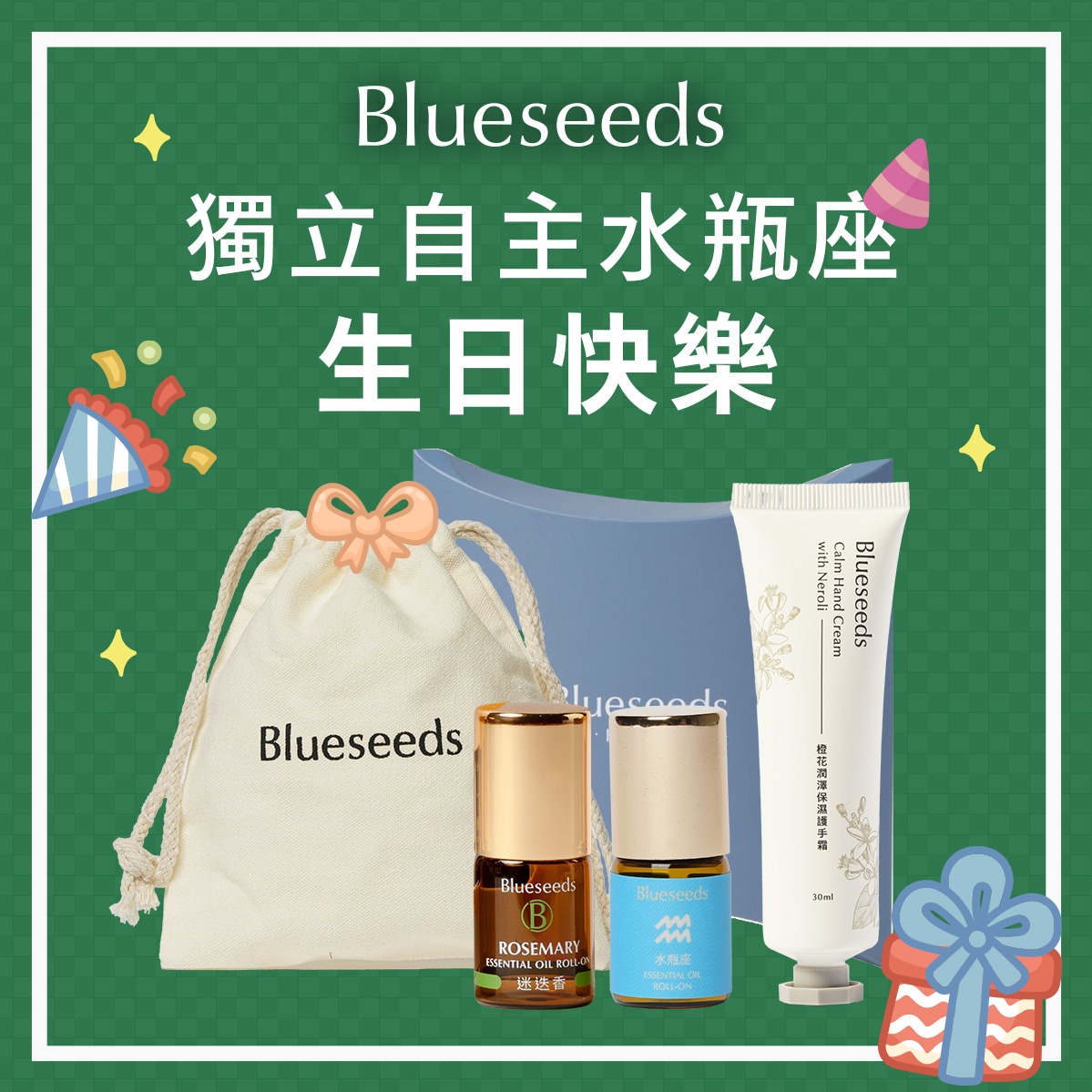 【Blueseeds】【收禮者可自選星座精油滾珠】生日快樂 1+1 獻給獨一無二的Ni l LINE禮物獨家 l 附品牌派盒+束口袋禮盒 l 芙彤園