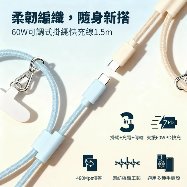其他說明事項: 暖手蛋規格: 電池容量:2500mAh鋰電池*2 充電時間:3.5小時*2 單面使用時間:4~8小時*2;雙面使用時間:3~5小時*2 輸入:TypeC 5V/1A 尺寸(CM):8.7*4.85*1.56cm*2 重量:69g*2 加熱溫度:3檔,100° - 108°F (38--42℃) / 109° - 117°F (43--47℃) / 118° - 125°F (48--52℃) 指示燈:紅色/藍色 產品材質:鋁合金、ABS塑膠 配件:TYPEC 充電線、說明書 快充線規格: 產品名稱:60W可調式編織掛繩快充線1.5米 產品型號:泡泡藍、厚奶茶 支持功率:60W(48V/5A) 支援資料:480Mbps USB規格:2.0 產品線長:1.5米 材質: TPE 插頭 + 麻紡編織線