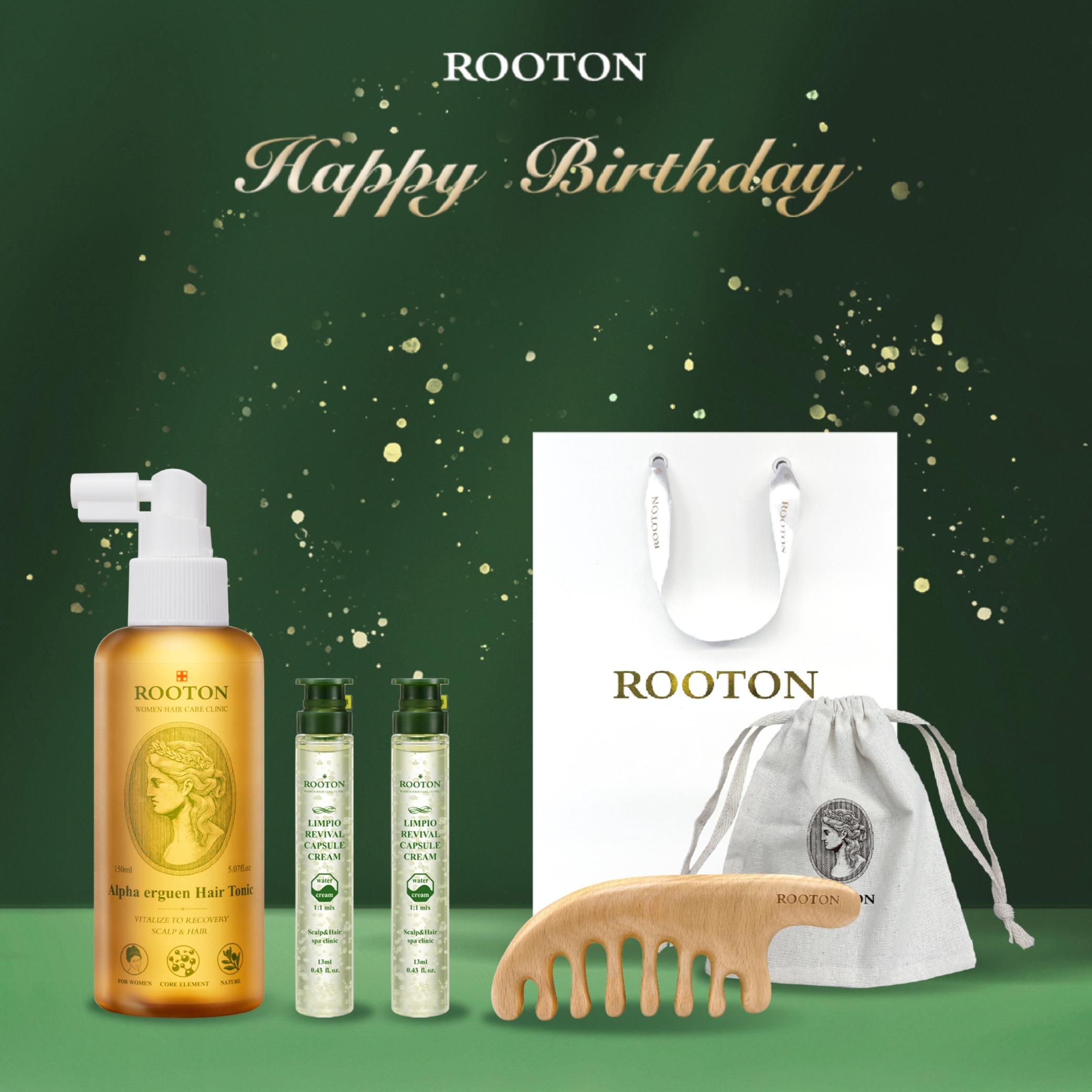 快速出貨【ROOTON】生日快樂!甦活植萃髮根噴霧150ml+甦活植萃洗髮精70ml+甦活植萃護髮素30ml+甦活養髮梳+棉麻束口袋+燙金禮袋(水瓶座生日禮物)