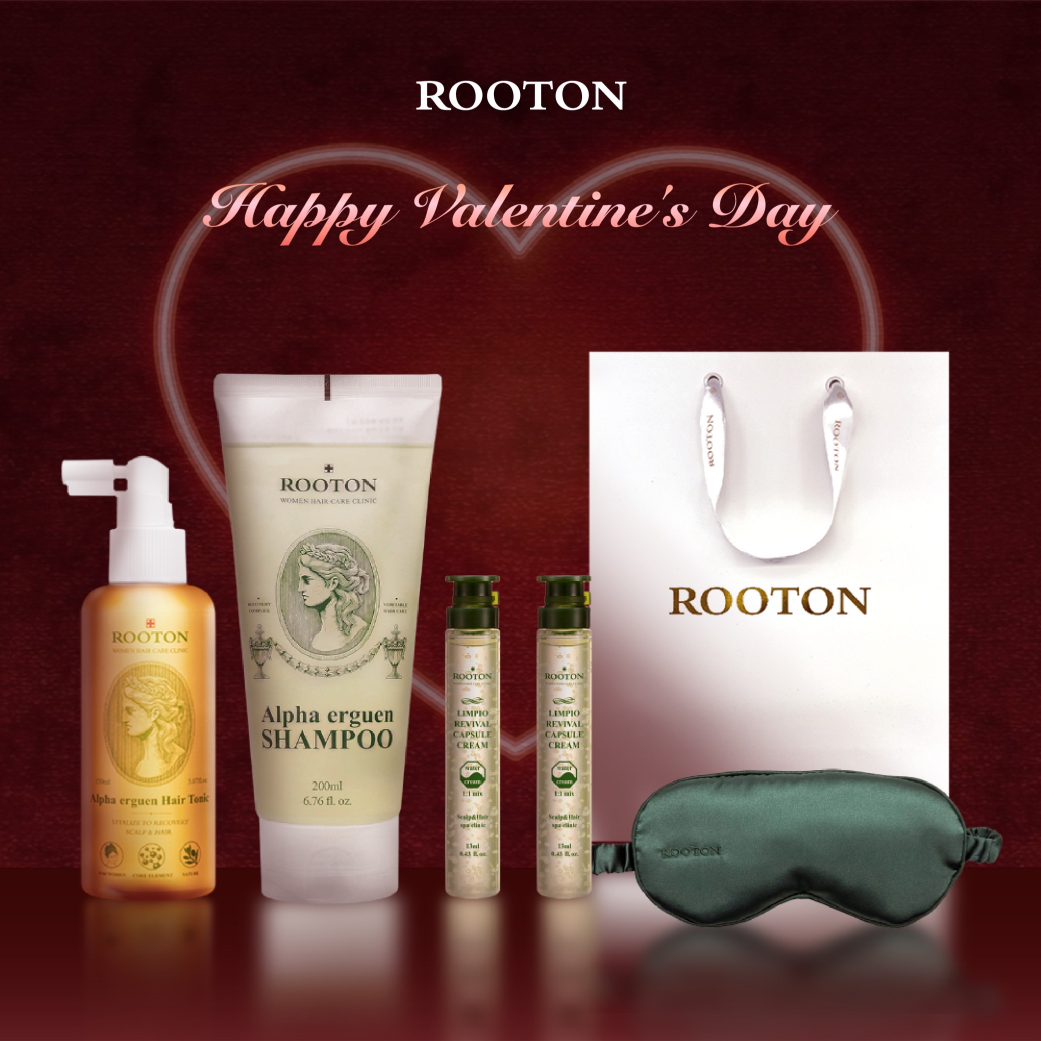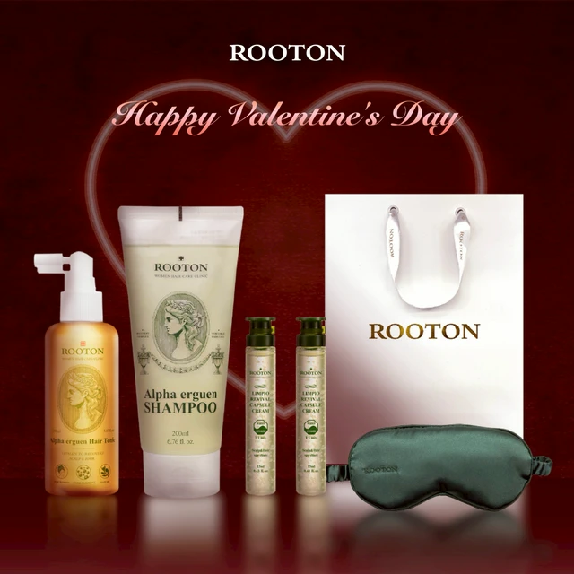 快速出貨【ROOTON】情人節快樂!髮根噴霧150ml+甦活植萃洗髮精200ml+沐浴膠5ml+身體乳5ml+甦活養髮梳+棉麻束口袋+情人節小卡+燙金禮袋