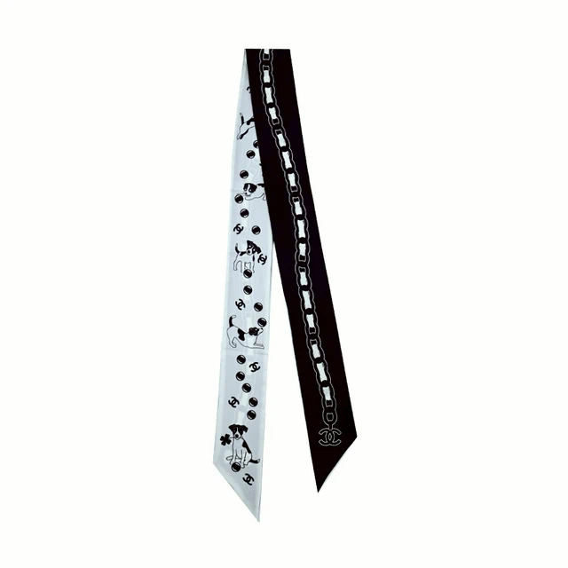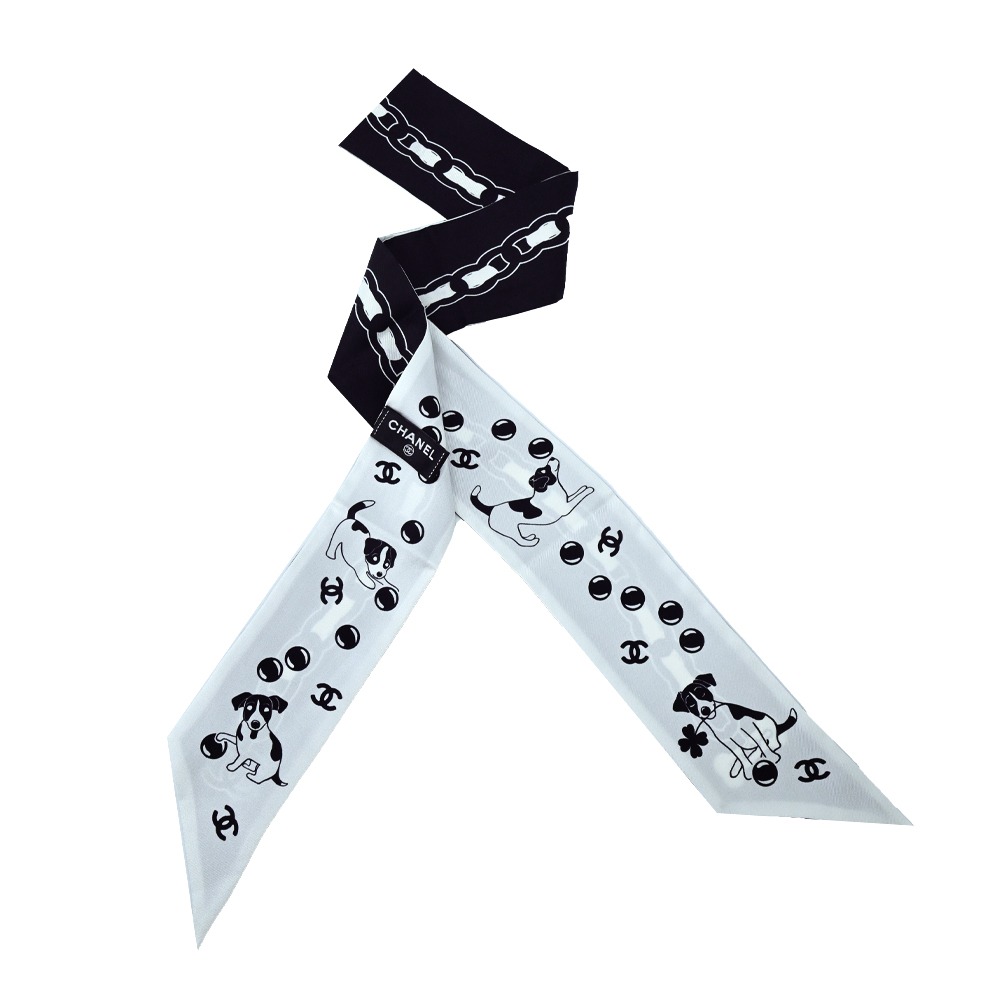 [平輸版] CHANEL 香奈兒車票印花雙面Twilly真絲絲巾/髮帶(奶白色)