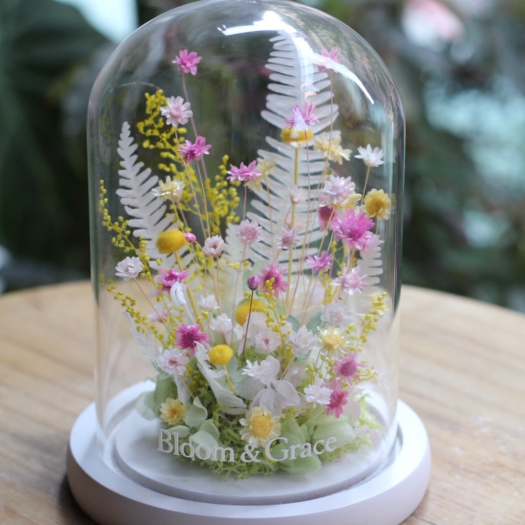 【Bloom & Grace 永生花禮花藝店】希望蒲公英永生花玻璃花盅(木頭底) 永生花 送禮 節日送禮 禮物 《全台寄送》