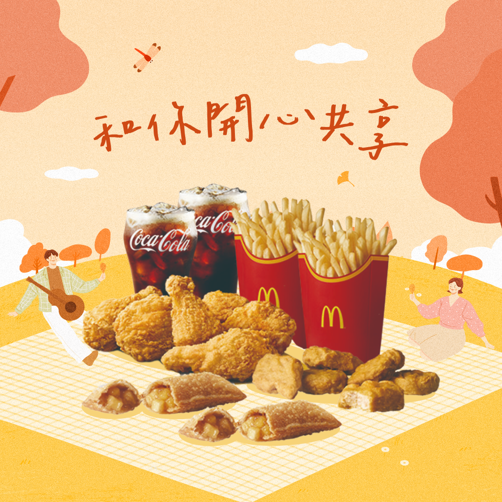 [麥當勞·2月限定麥心意]【麥當勞】麥脆鷄腿2塊 (原味)+勁辣鷄腿堡+麥克鷄塊6塊+薯條(大)+可樂(中)x2好禮即享券