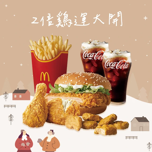 [麥當勞·2月限定麥心意]【麥當勞】麥脆鷄腿2塊 (原味)+勁辣鷄腿堡+麥克鷄塊6塊+薯條(大)+可樂(中)x2好禮即享券